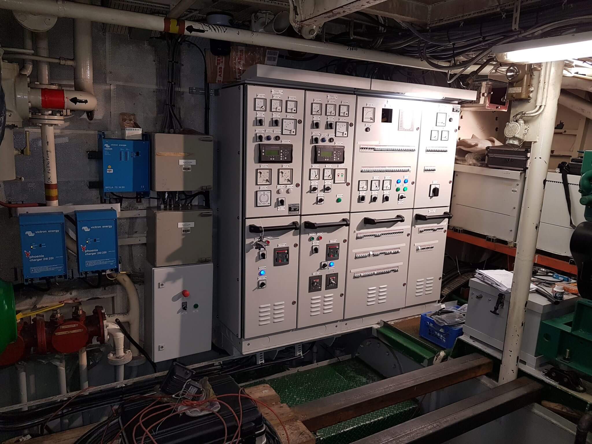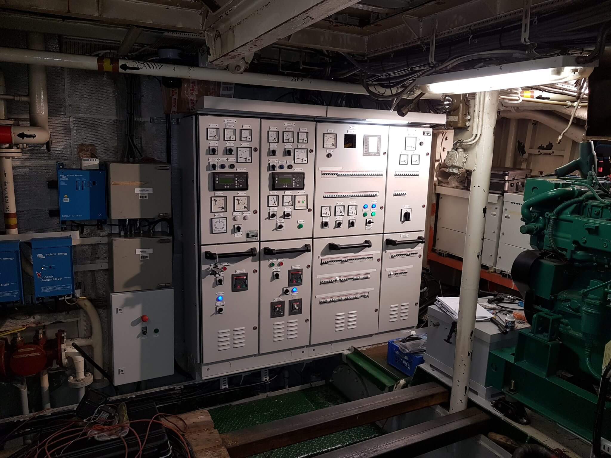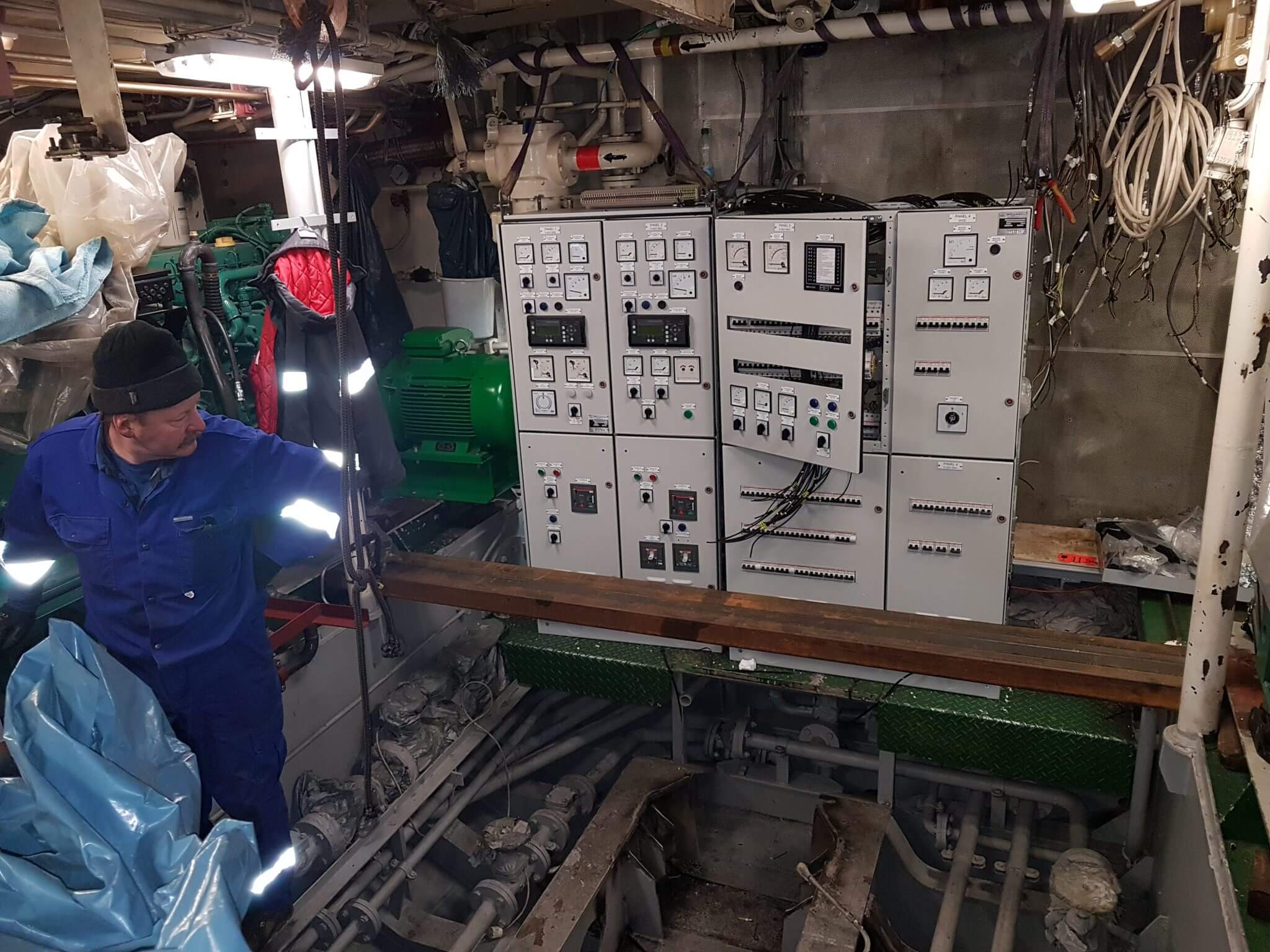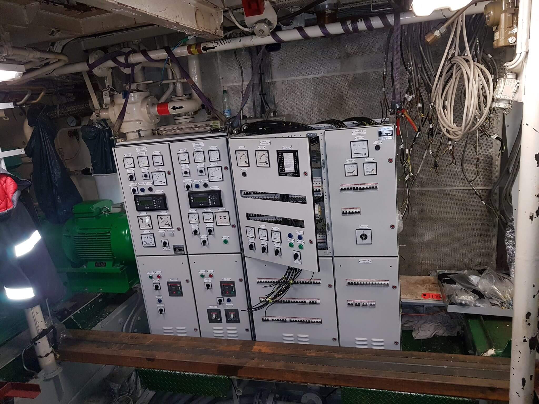 Nasi ślusarze zainstalowali rozdzielnicę w maszynowni a elektrycy podłączyli odbiory statkowe. Stara instalacja uwzględniała zasilanie tylko 230VAC, teraz jest 400VAC – wymagane były dodatkowe transformatory separujące i zasilające automatykę starterów.