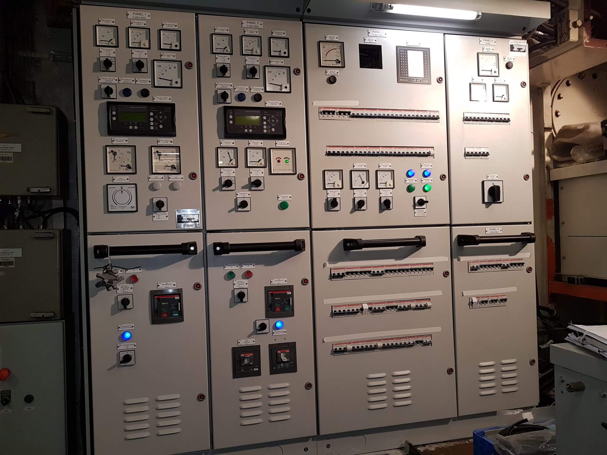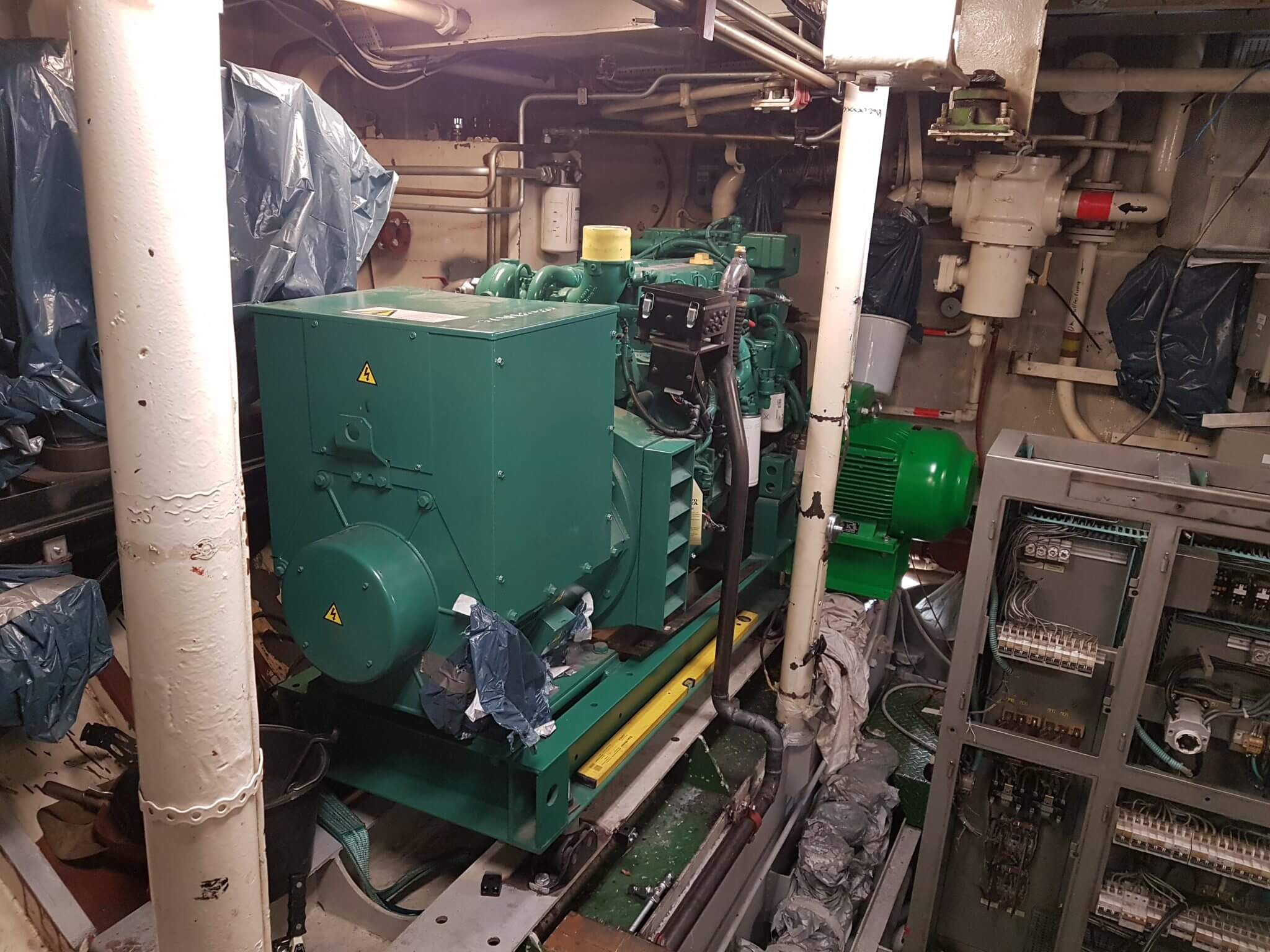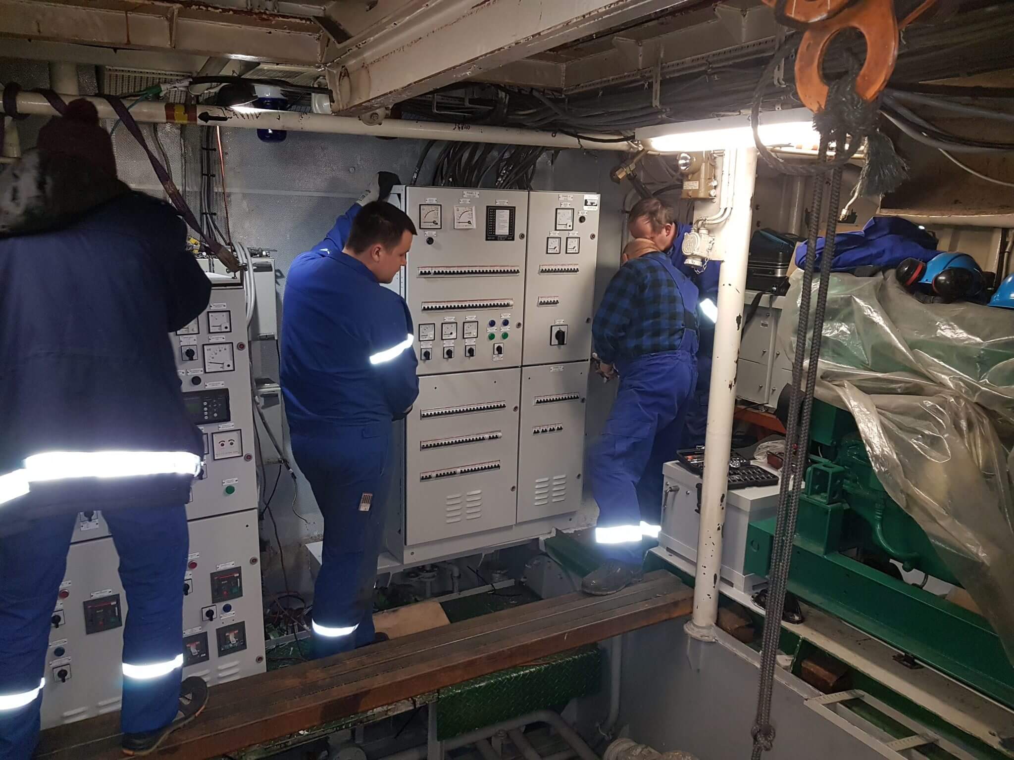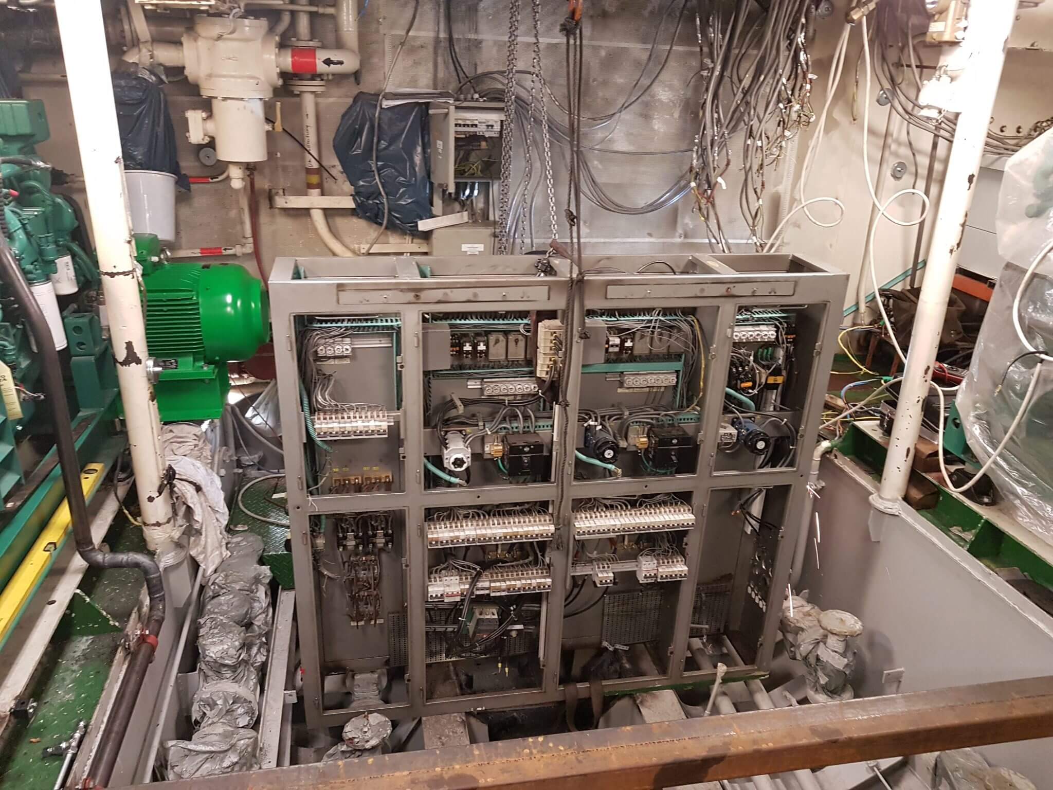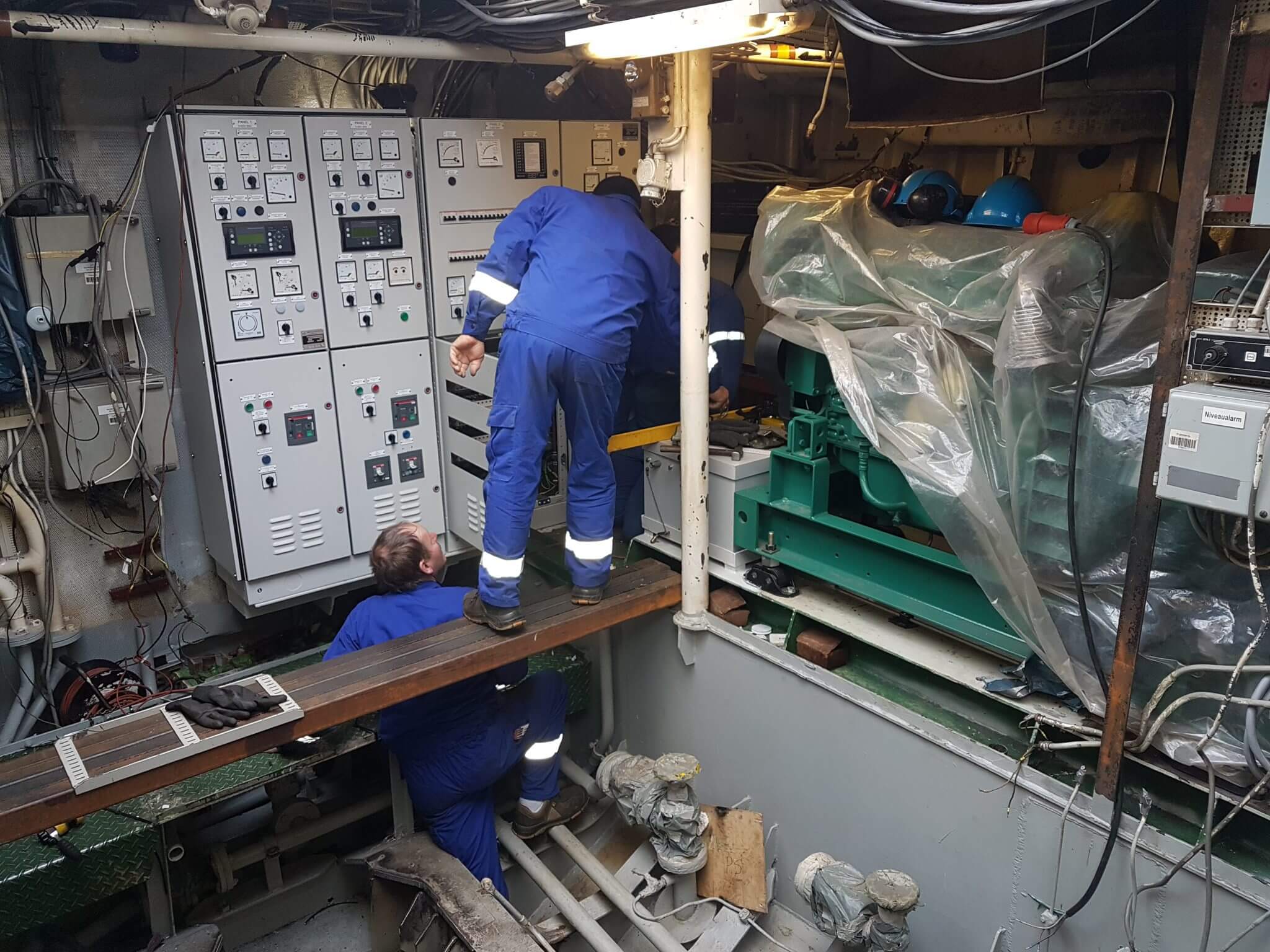 Nasi ślusarze zainstalowali rozdzielnicę w maszynowni a elektrycy podłączyli odbiory statkowe. Stara instalacja uwzględniała zasilanie tylko 230VAC, teraz jest 400VAC – wymagane były dodatkowe transformatory separujące i zasilające automatykę starterów.