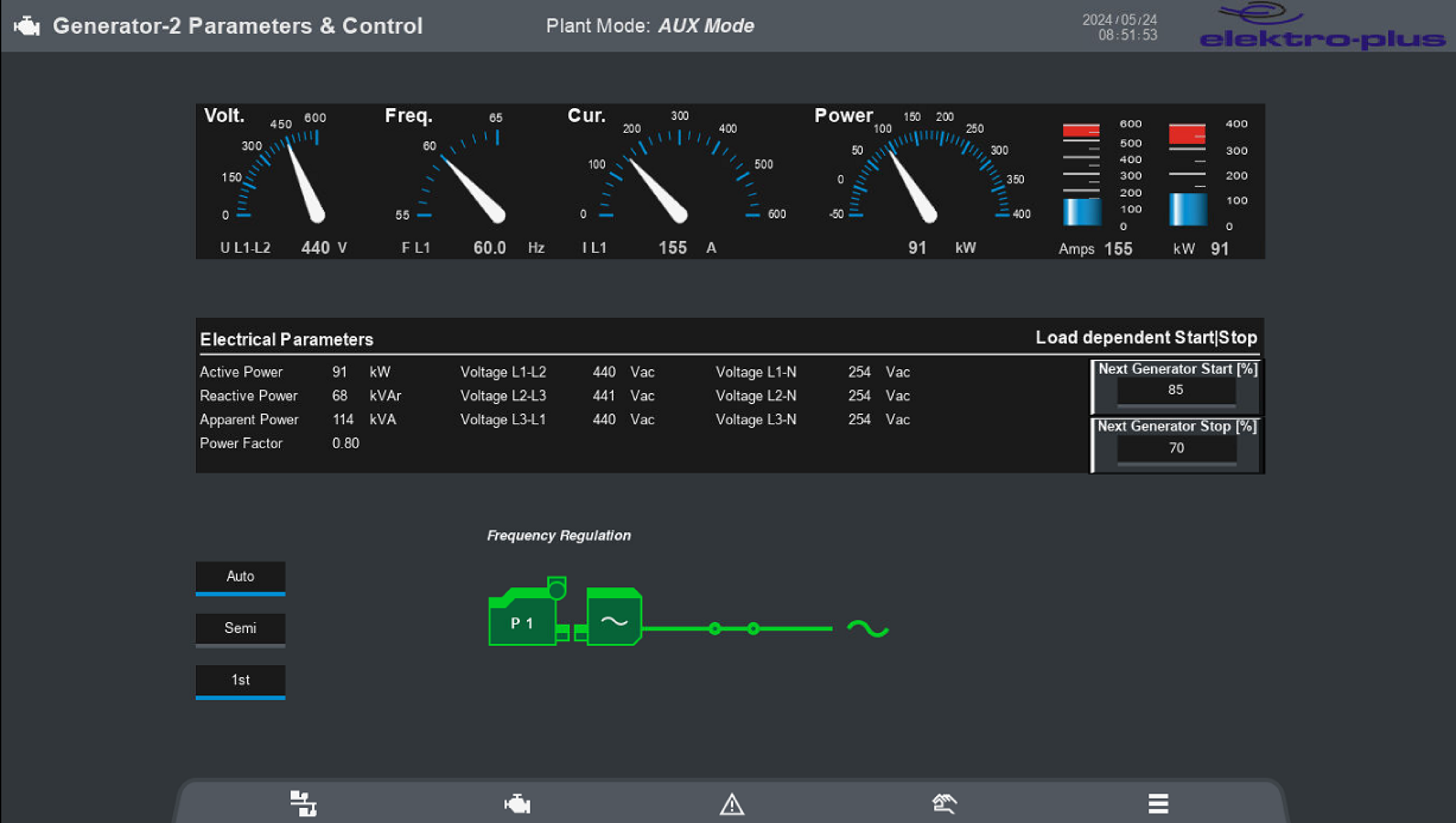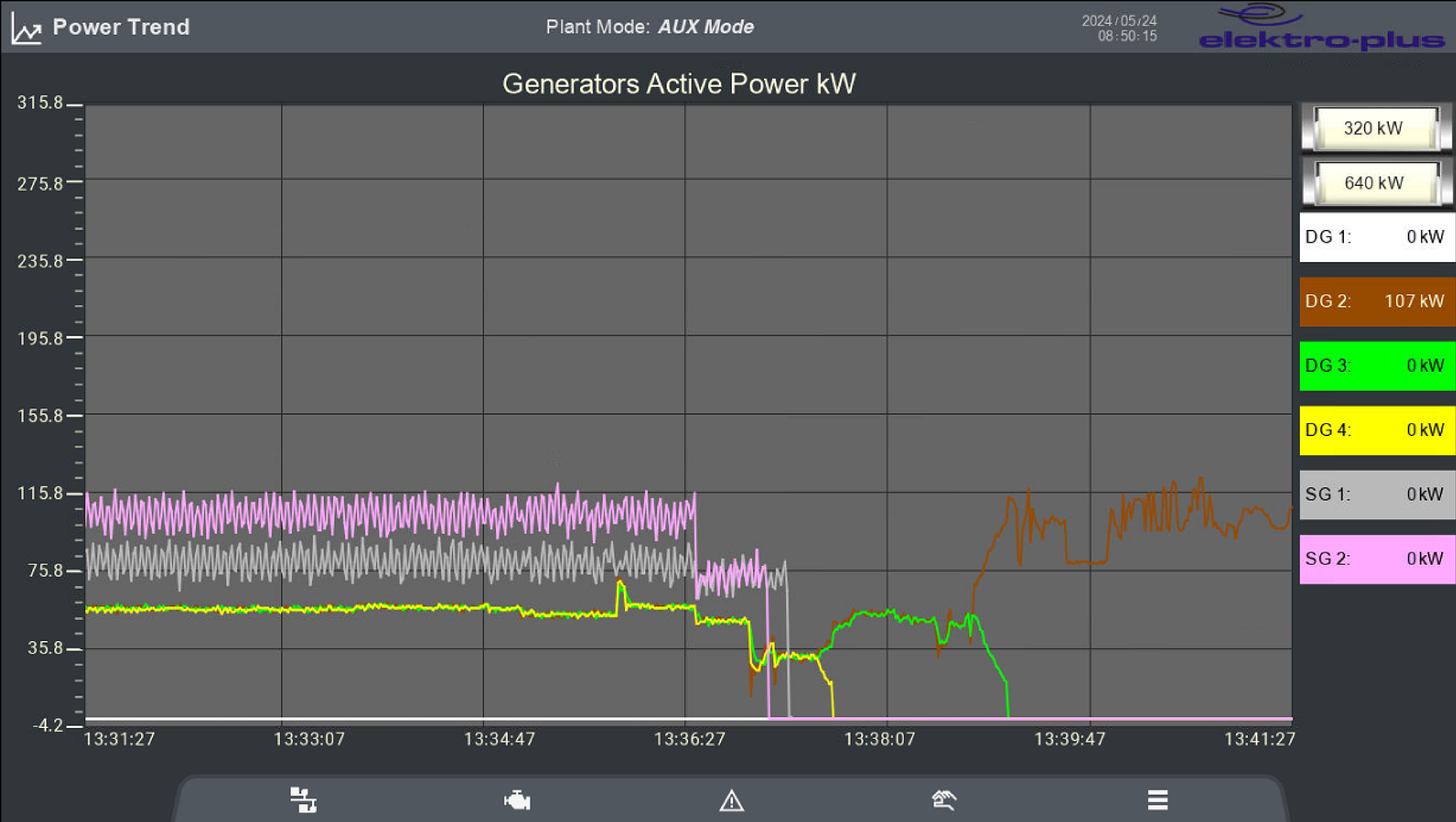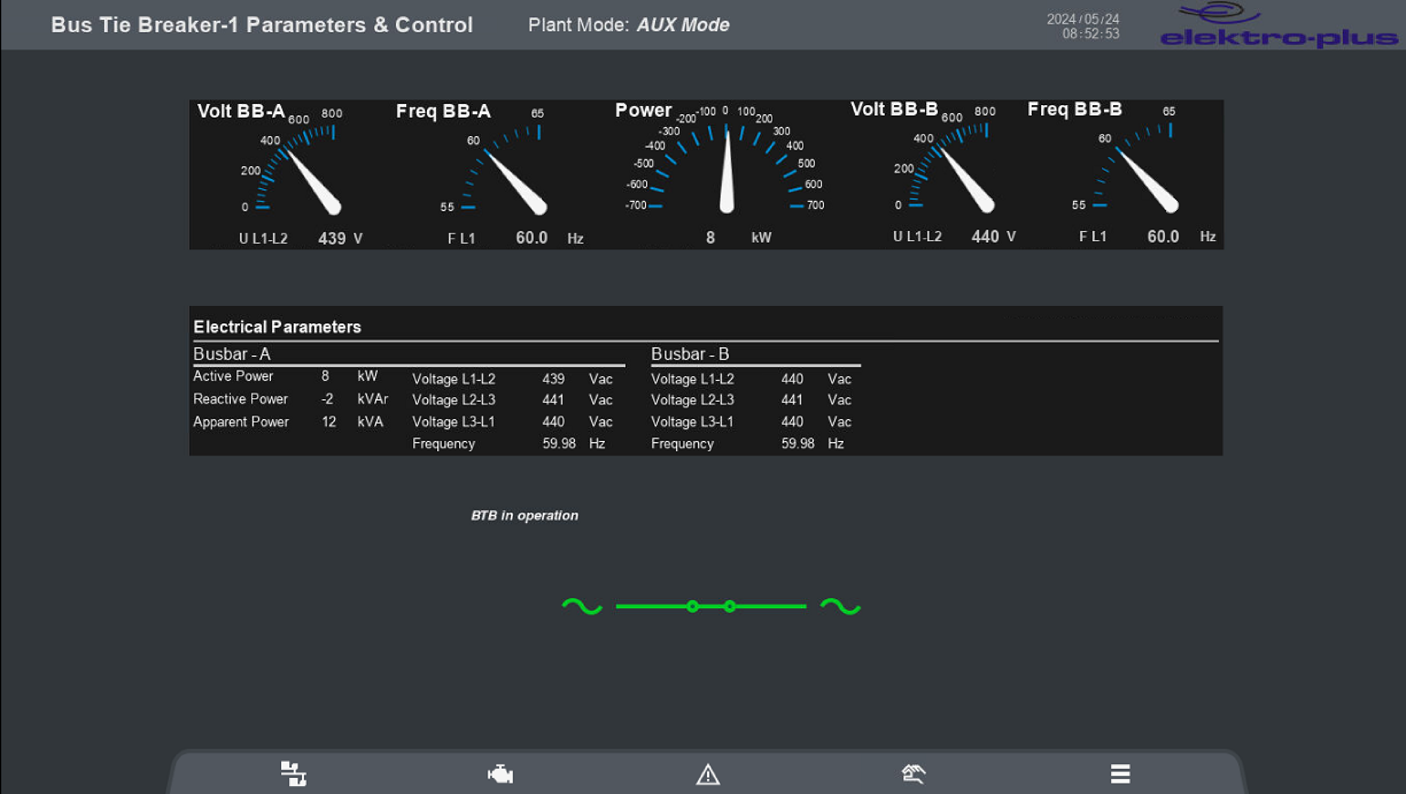 W odniesieniu do tych funkcji system jest zdolny do komunikowania się z każdym sterownikiem wyłącznika, monitorowania ich pozycji oraz obciążenia, dokonywania automatycznej synchronizacji, dozoru jakości energii w celu ochrony agregatów oraz odbiorów przyłączonych do szyn zbiorczych. Wszystkie zdarzenia są zapisywane w dzienniku alarmowym, który jest dostępny na stronie alarmowej oraz zapisywany w pamięci przenośnej.