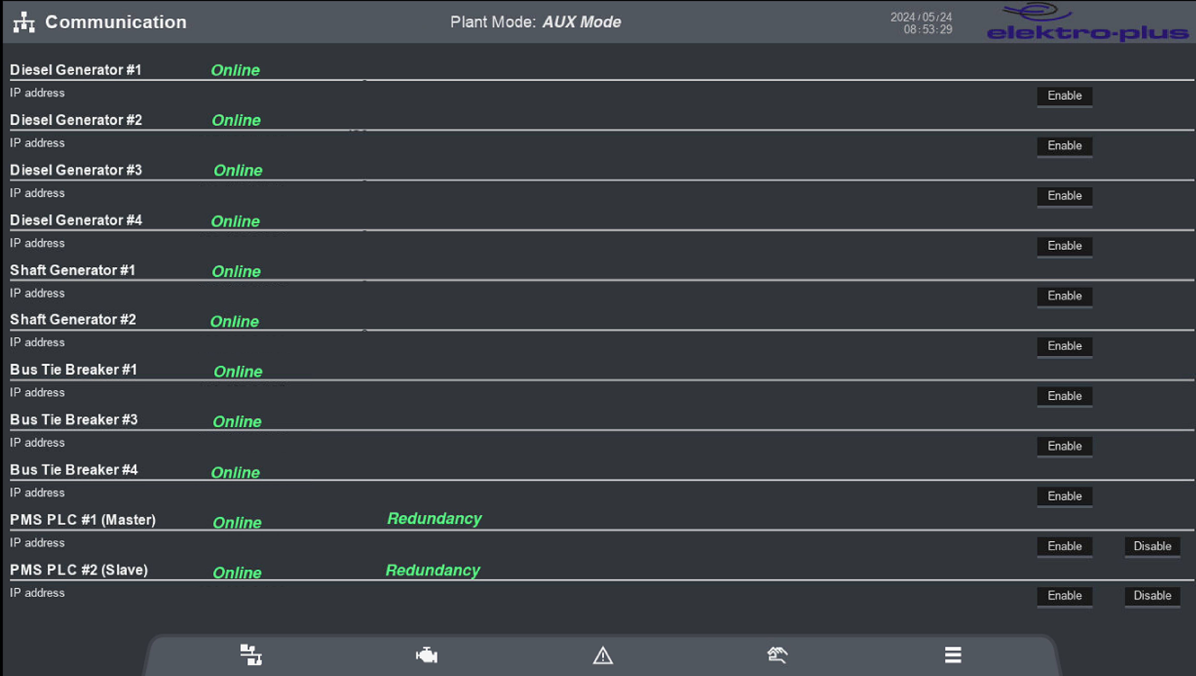 Protokół EtherCat gwarantuje redundancyjną komunikację pomiędzy kontrolerami. Komunikacja pomiędzy PLC, kontrolerami zarządzającymi systemem oraz ekranami dotykowymi została zrealizowana w standardzie Modbus TCP/IP. Opisany system składa się z modułów DEIF przystosowanych do rozwiązań morskich: PPM 300, AMC 300 i AGI 400.