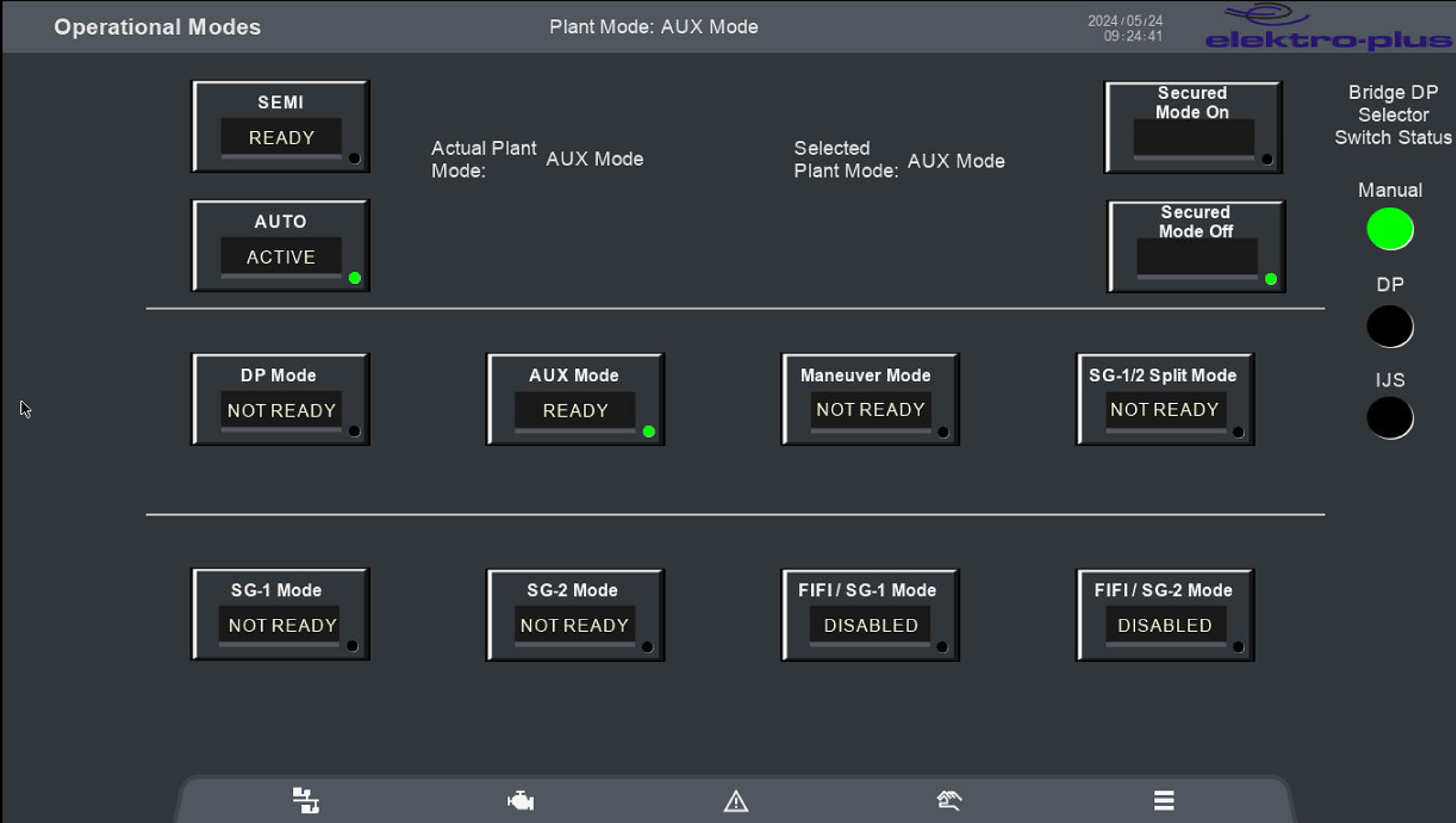 Gdy każde źródło energii zawarte w elektrowni okrętowej jest gotowe do pracy (nie ma żadnego aktywnego alarmu) dostępnych jest 8 trybów: